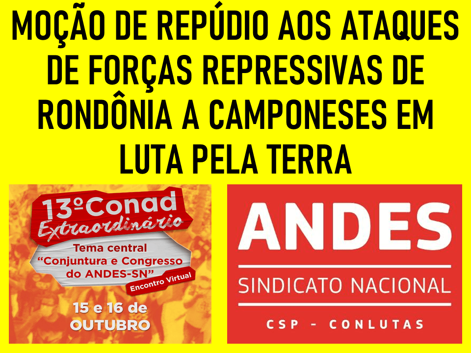 O 13ª CONAD – Congresso Extraordinário do ANDES-SINDICATO NACIONAL, reuniu dezenas de delegados nos dias 15 e 16 de Outubro para discutir inúmeras matérias relacionadas à categoria de professores do Ensino Superior do Brasil. Em sua sessão de moções, os delegados aprovaram por unanimidade que MANIFESTAM “total repúdio contra a violência perpetrada pelo Estado de Rondônia e o governo Bolsonaro-Mourão, que criminaliza a luta pela terra e utiliza do aparato repressor em grande operação de cerco contra os acampamentos Tiago dos Santos e Ademar Ferreira, na zona rural de Porto Velho/RO”.